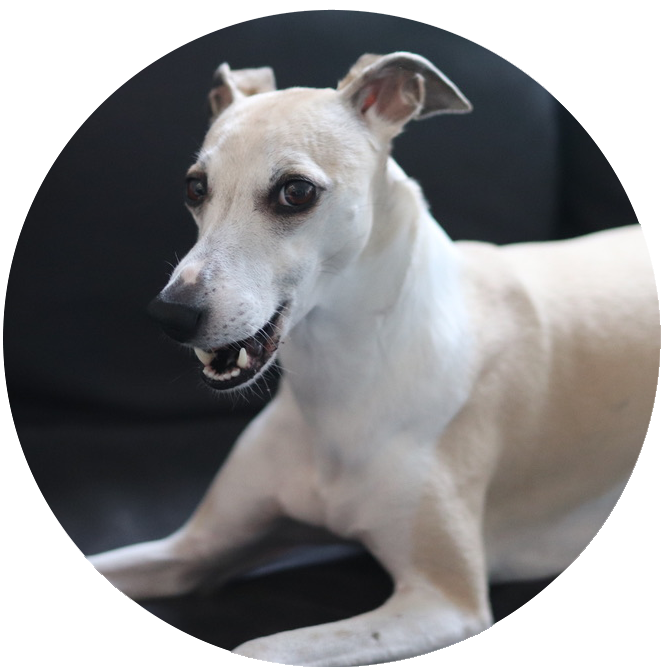 Wenn Whippet-Hündin Faye mit Herrchen Dieter morgens ins Büro kommt ist immer große Freude angesagt. Der Rest des Tages besteht vor allem aus Entspannung im kuscheligen Körbchen und dem Bunkern und Bewachen von Kausnacks.